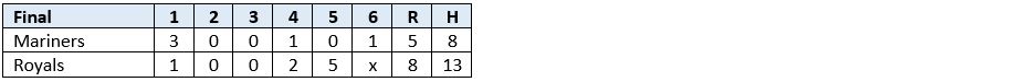 The Mariners scratched across one final run in the sixth, but the Royals held firm, securing their fourth straight doubleheader sweep to remain undefeated at 8 – 0.