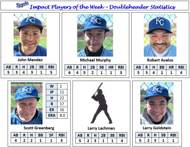 In conditions better suited for polar bears than softball players, the Royals extended their perfect start to the season with their seventh and eighth consecutive victories on Sunday, overcoming early deficits to defeat Garber’s Athletics, 19 – 12, and Miller’s Mariners, 8 – 5.