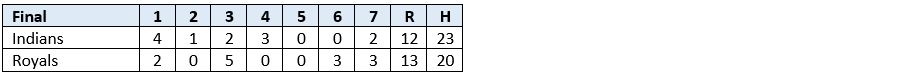 The Indians struck first in the seventh, plating two to grab a 12 – 10 lead. But these Royals had one more rally in them.